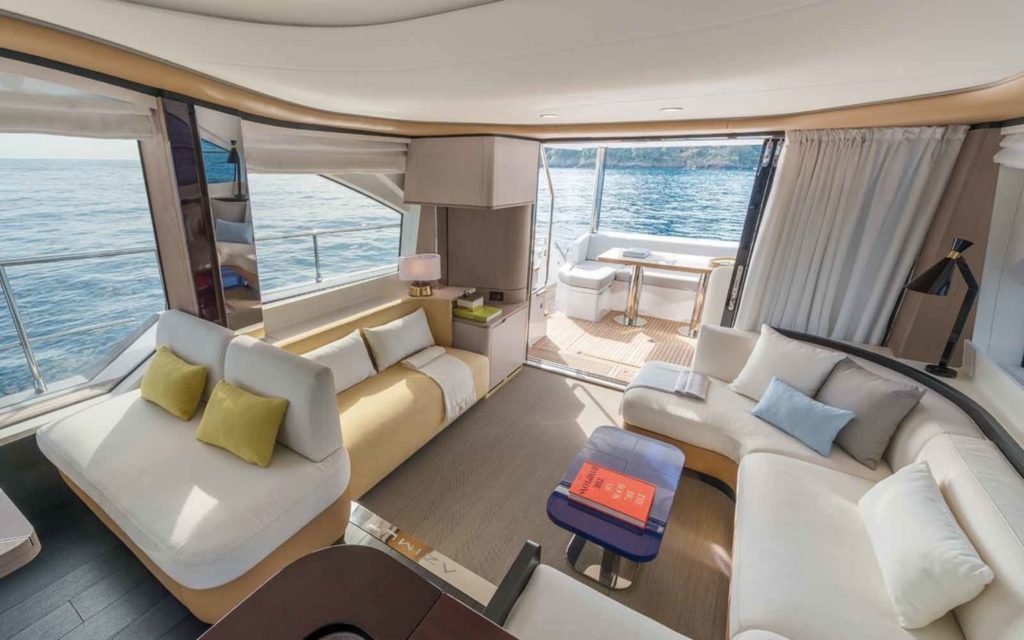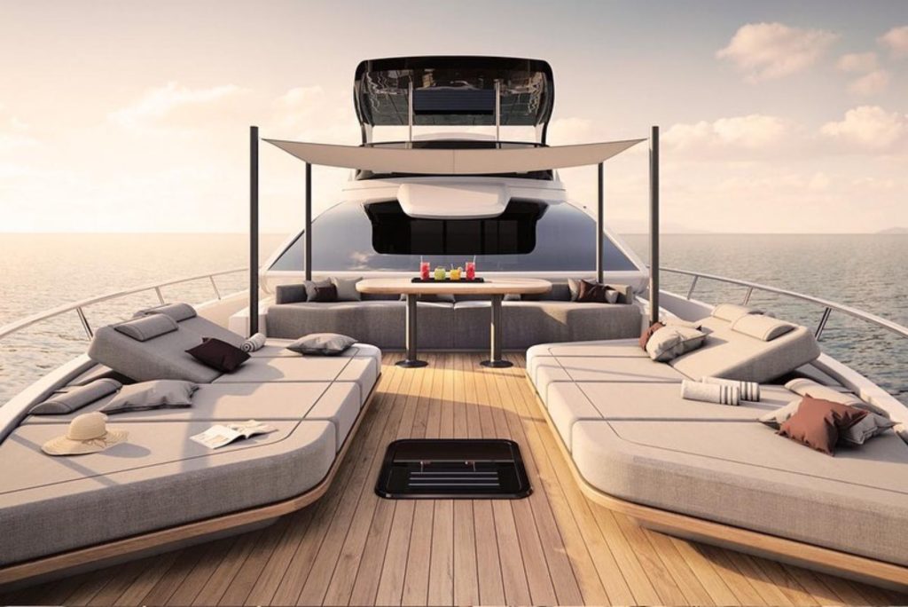 Os móveis são exclusivos e feitos por artesãos italianos. Os materiais são nobres e resistentes a água, proporcionando um belo conforto térmico. Há também lounges privativos na proa e no flybridge, características inéditas em barcos dessas dimensões.