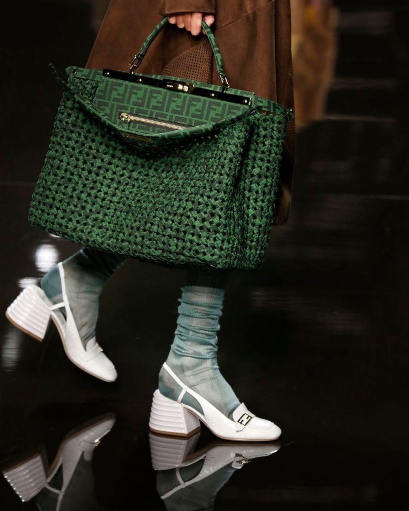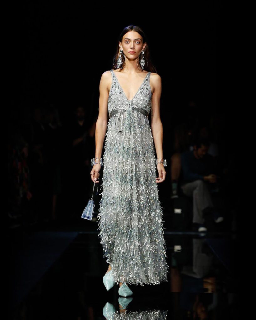 Em seu desfile, a Fendi resgatou a moda safári com peças em tons terrosos como jaquetas e macacões. Meias aparecendo também marcaram presença no desfile, dando um toque mais jovial e despojado ao look. A partir de agora, se você quer brilhar nas festas aposte no prateado. A Emporio Armani usou e abusou dessa tendência em seu desfile. Os acabamentos dos vestidos era o que mais chamavam a atenção.