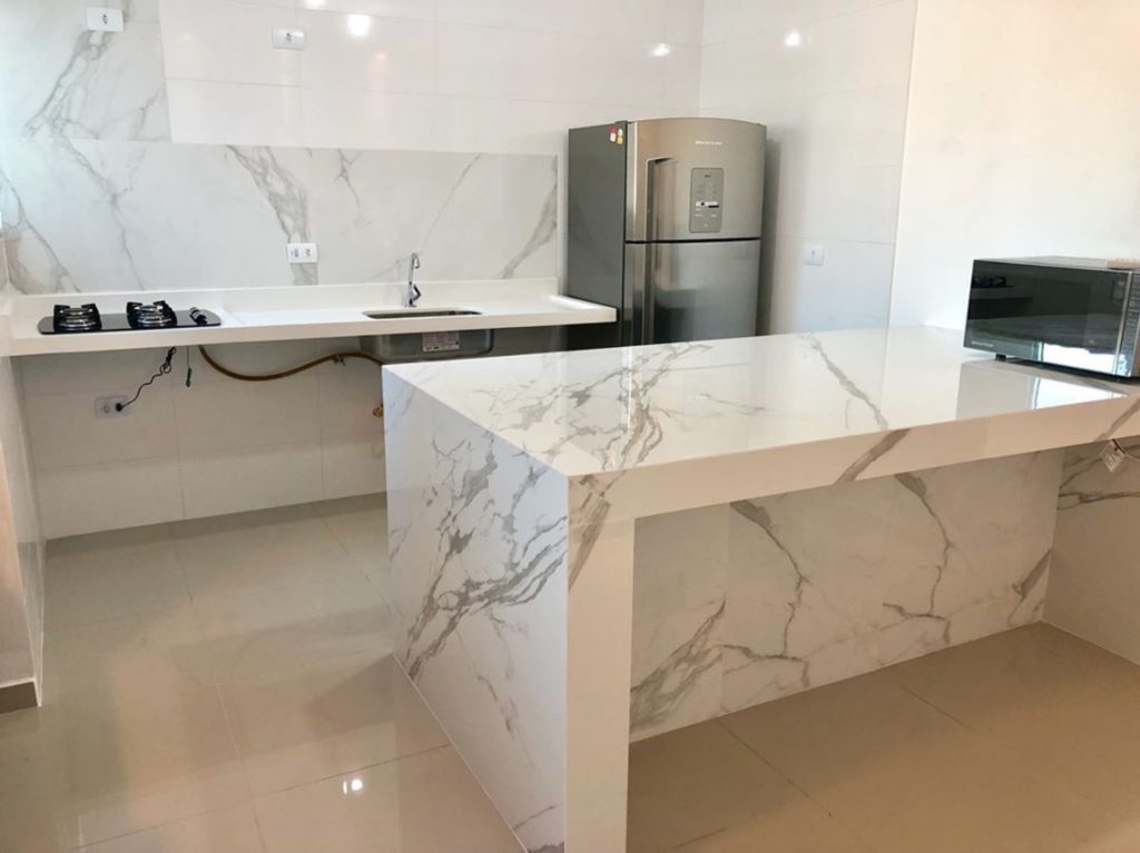 Uma ideia é combinar o mármore com a cor que a parede está pintada, desse modo você pode brincar com as cores. A peça pode ser usada para compor alguns detalhes na parede ou ser usada como uma bancada no estilo cozinha americana.