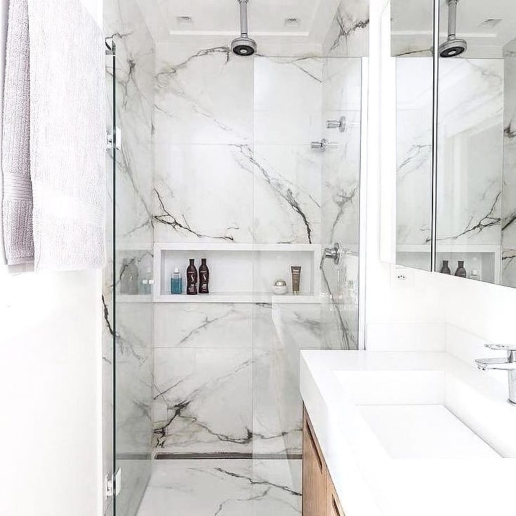 Essa parte da casa acaba sendo mais esquecida na hora da decoração, pois muitos acham que esse cômodo não precisa de muitos acessórios. Se você pensa assim, apostar no mármore em forma de parede é uma ótima saída para causar um bom impacto visual em quem entrar no seu banheiro.