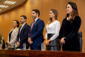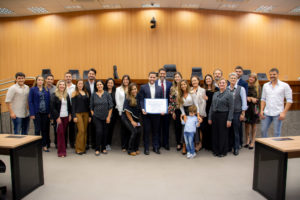 A mesa foi composta pelo vereador Nelson Hossri, que presidiu a reunião solene, além da sócia da clínica Dr. Sérgio Maia, Verônica Matos, e a mãe e avó do homenageado, Maria Nazaré Guerino Vasques e Cátia Vasques.\r