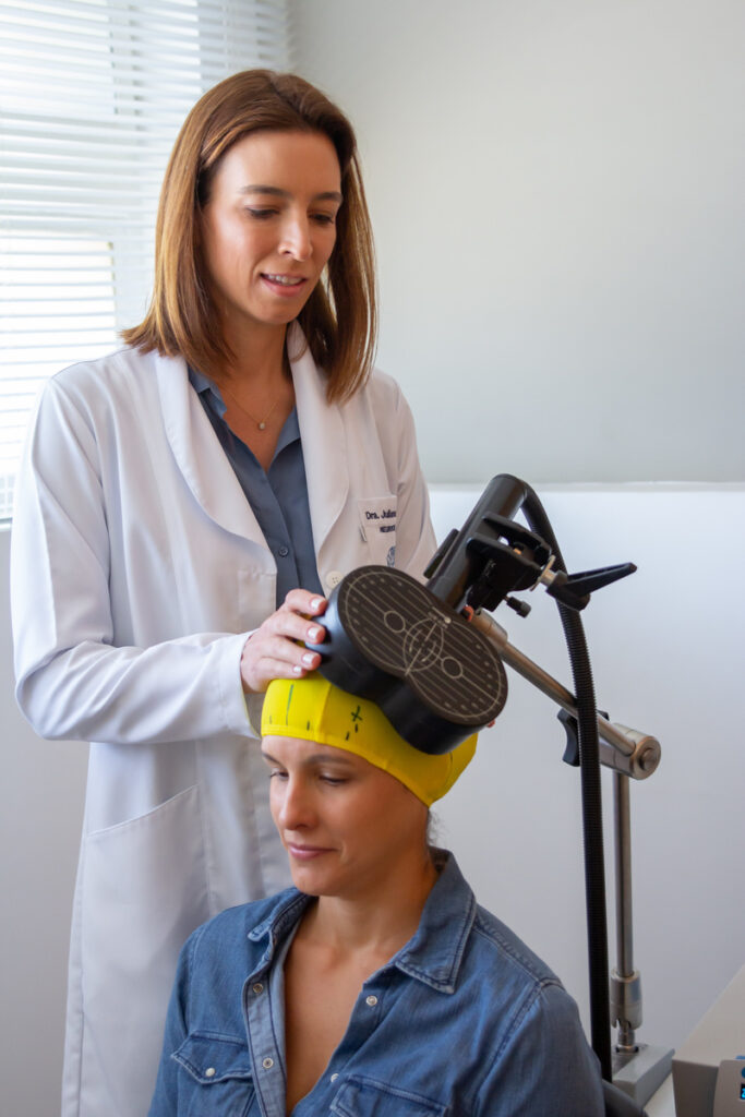 De acordo com a Dra. Juliana, para cada doença há parâmetros de estimulação, direção de posicionamento do equipamento no crânio, intensidade do estímulo magnético e tempo médio de sessões e tratamento, entre outras regulações para a aplicação.