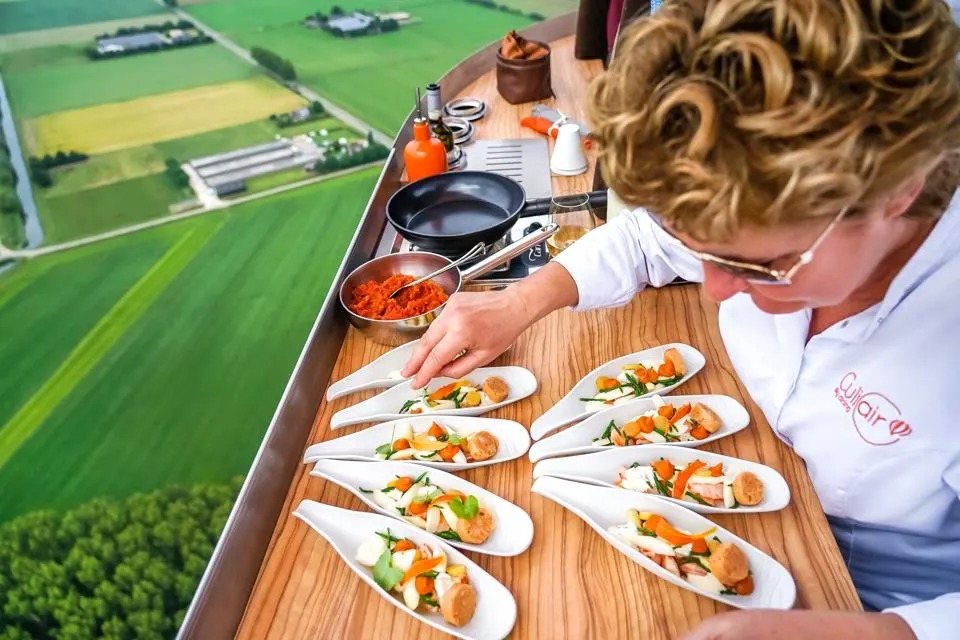 A CuliAir oferece passeios culinários de balão por diversas áreas da Holanda, escolhendo locais com as melhores condições climáticas para proporcionar uma experiência tranquila e memorável. A duração do voo, aproximadamente uma hora e meia, oferece tempo suficiente para apreciar o jantar preparado à la minute, enquanto se contempla a paisagem lá do alto. Com o CuliAir Skydining, Angélique Schmeinck prova que a criatividade culinária não tem limites, proporcionando uma aventura gastronômica que os convidados nunca esquecerão. O balão pode acomodar até 10 passageiros, e a melhor época para reservar o voo é junho, agosto e setembro para o clima ideal. O custo é de 475 euros por pessoa, incluindo jantar e passeio de balão.