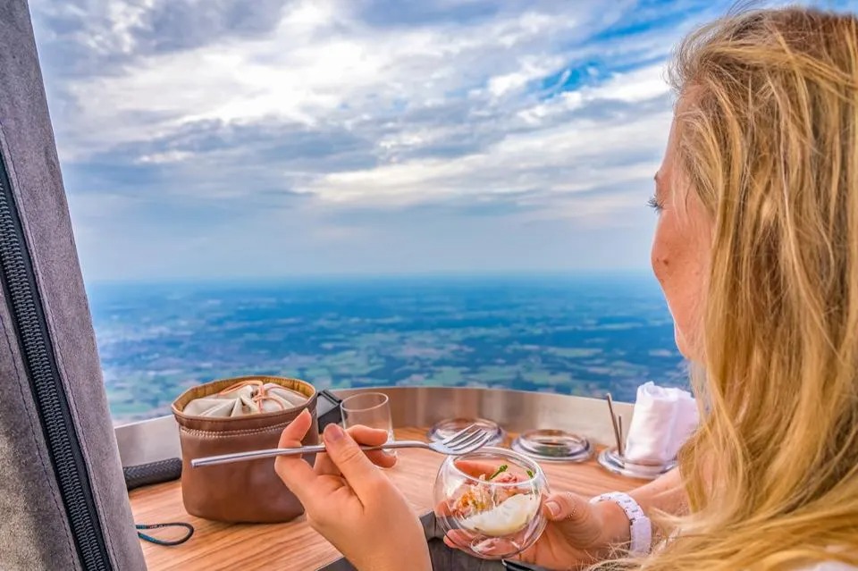 O primeiro restaurante de balão de ar quente do mundo, criado pela chef holandesa Angélique Schmeinck, oferece uma experiência única: um jantar de três pratos enquanto flutua pelos céus da Holanda