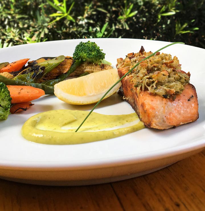 - Terra Mares: Posta de salmão em crosta servido com legumes de raiz braseados e duo de salsas frescas (abacate e manga).