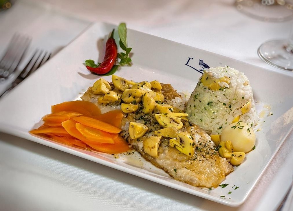 - Saint Peter ao molho de finas ervas, servido com arroz e cenoura agridoce.