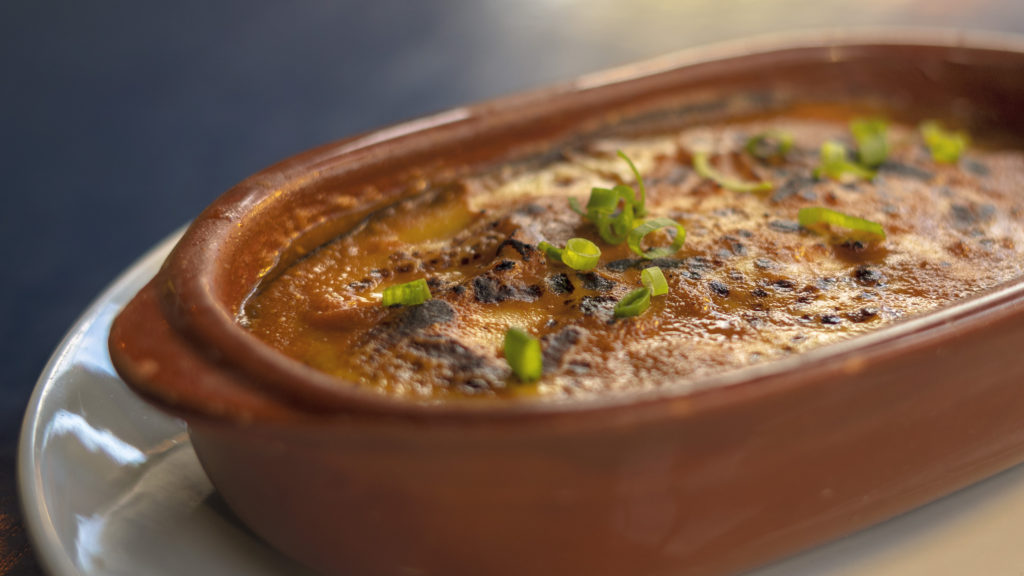 - Creme de cabotiã com crispy de carne seca.